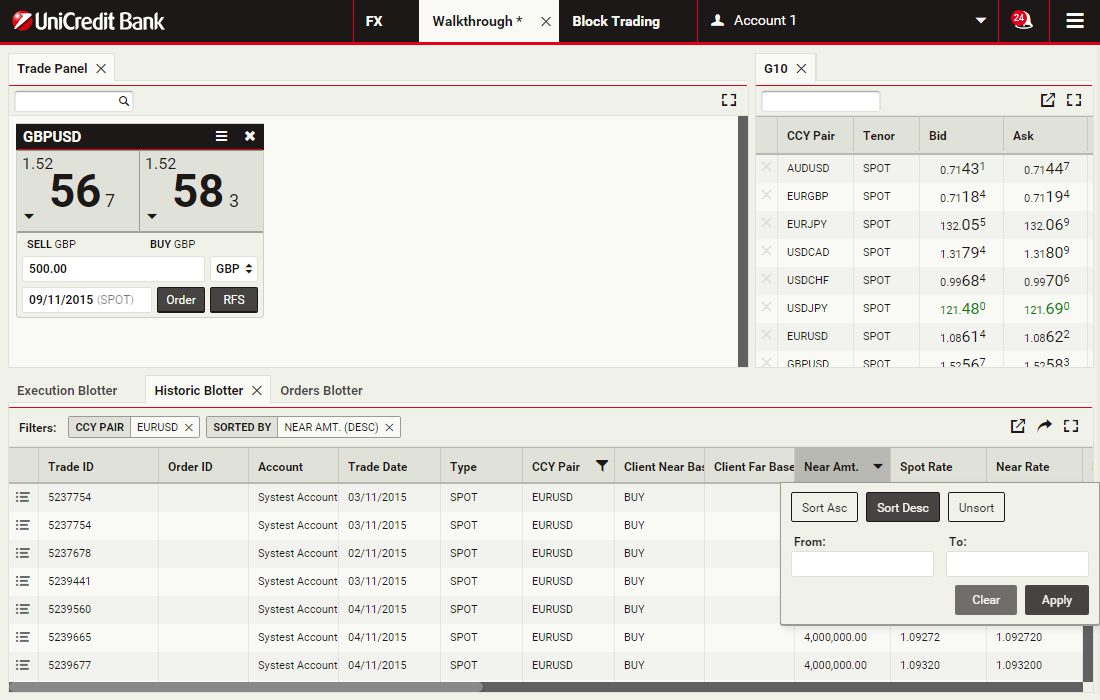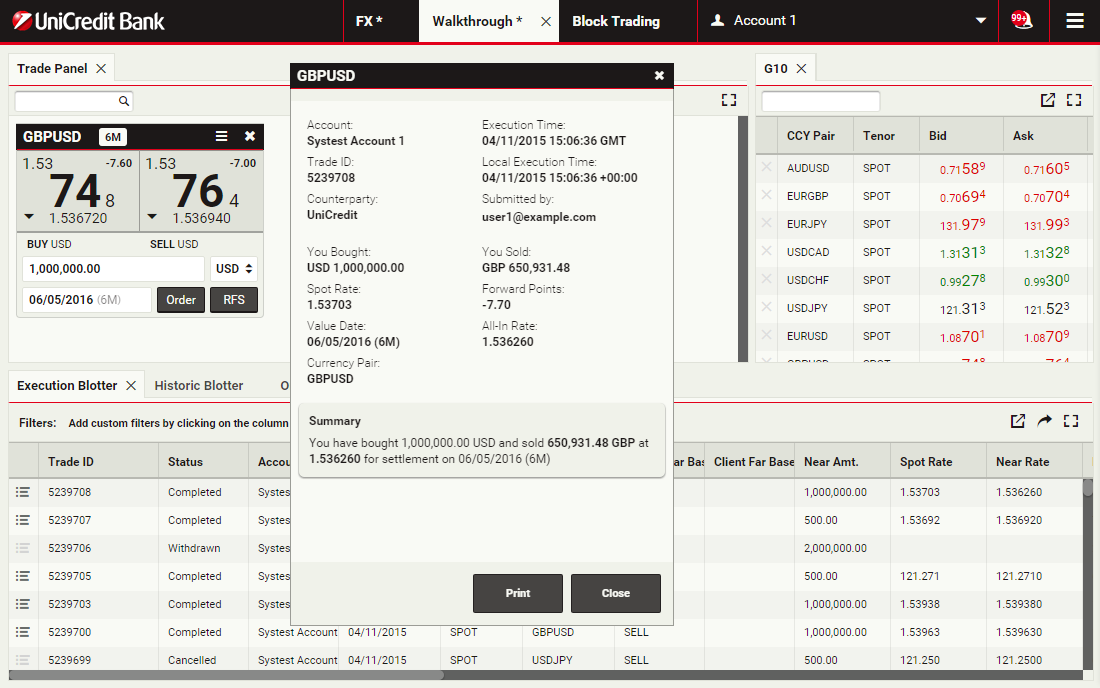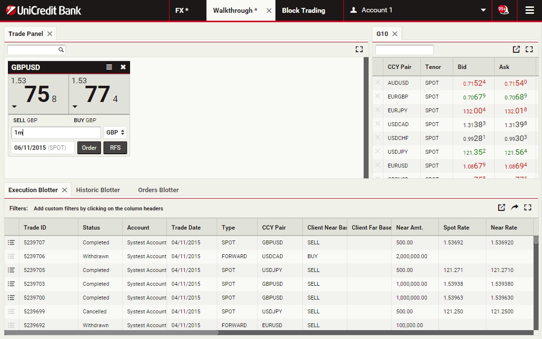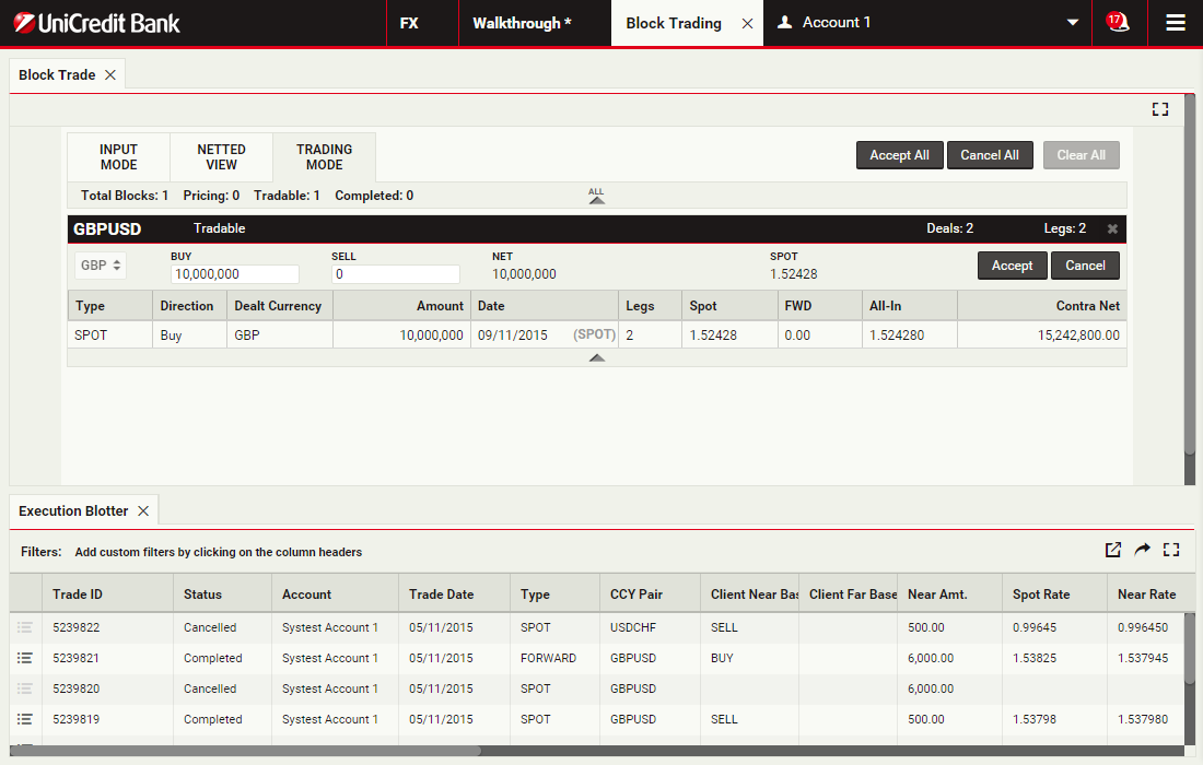 Using block trading, you can submit a request for a single executable quote on simultaneous deals in the same currency pair across multiple accounts and valuation dates. You can enter the deals directly or upload them in a spreadsheet template and UCTrader will automatically validate and net them where possible.