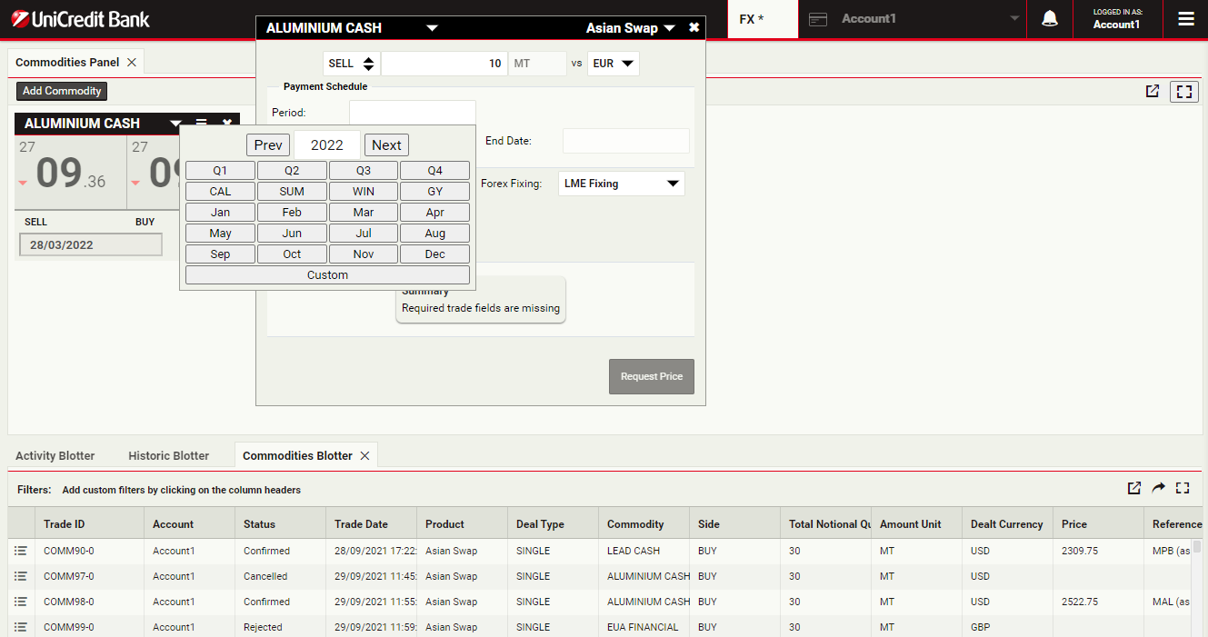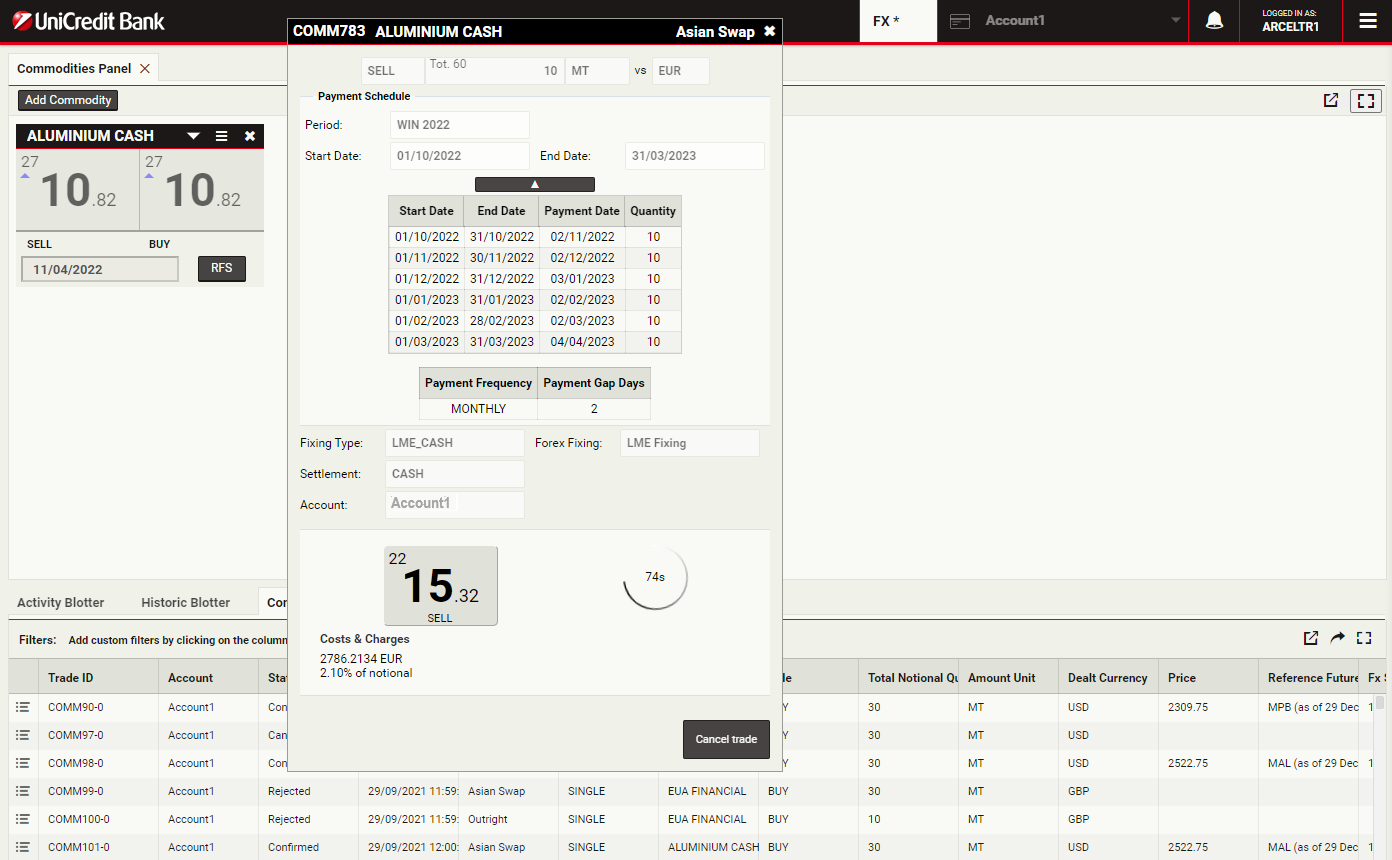 To launch a swap ticket for Aluminium, click RFS on an Aluminium Cash tile