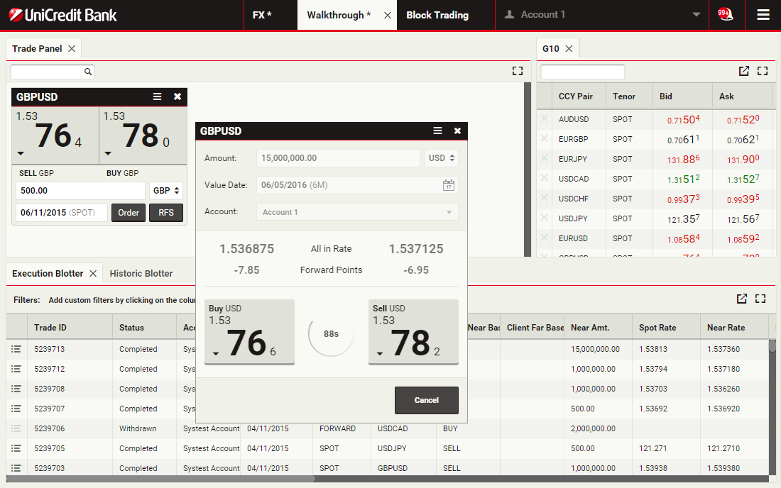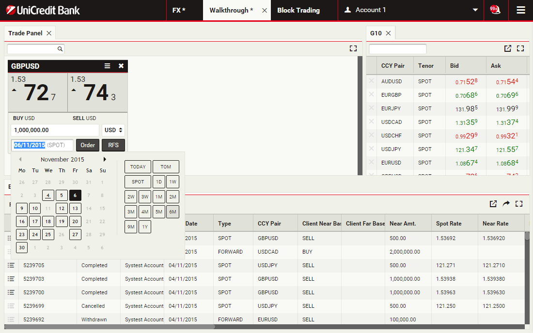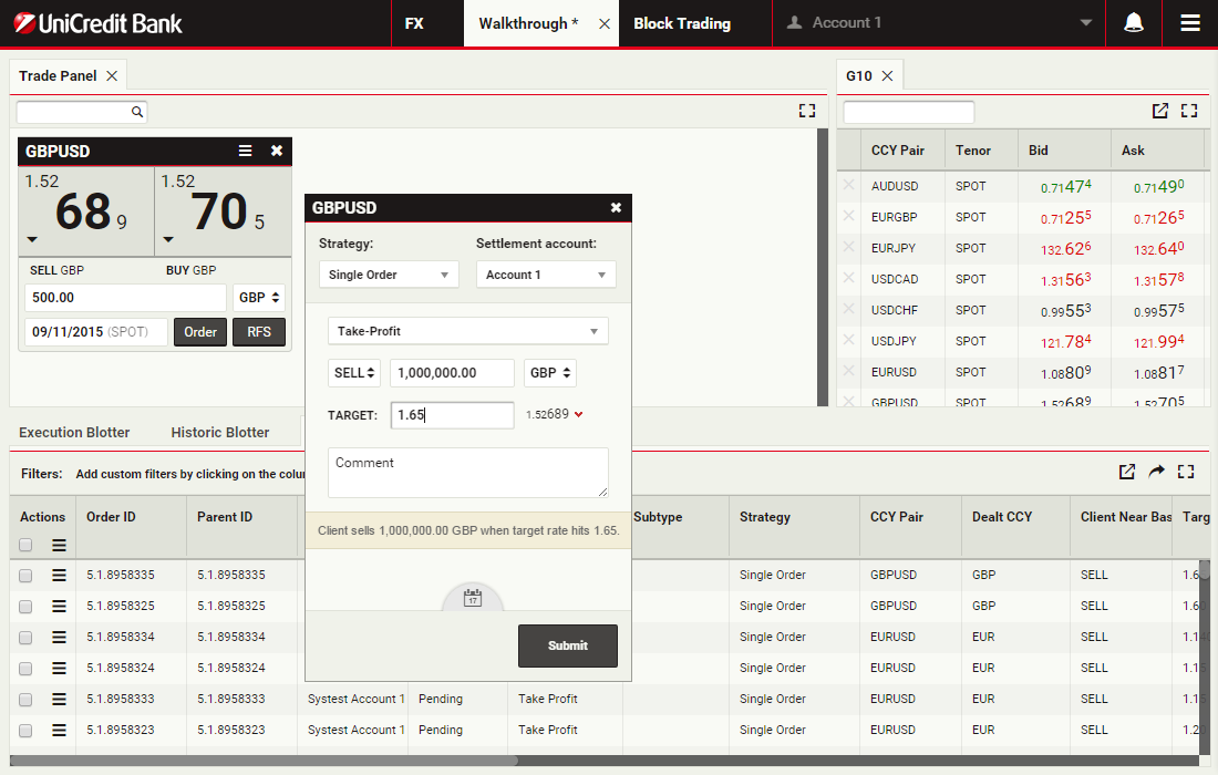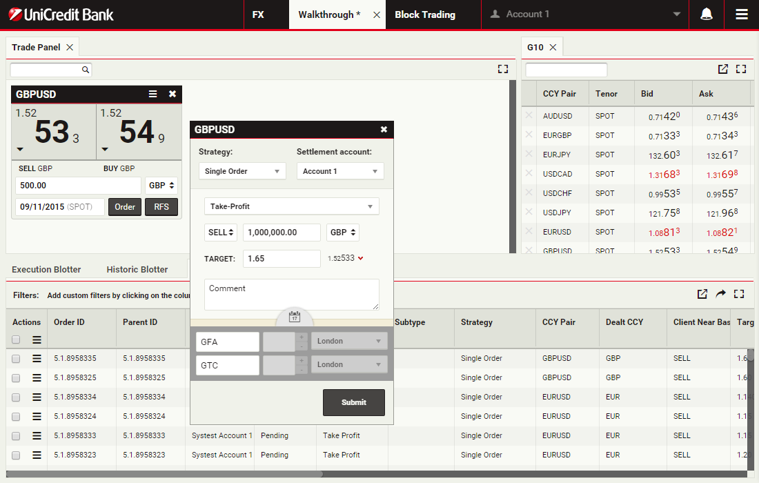 In this walkthrough, you will use a GBPUSD order ticket to prepare and submit a Take Profit order to sell 1 million GBP, with a Time-in-Force (TIF) of 1 month after spot.
