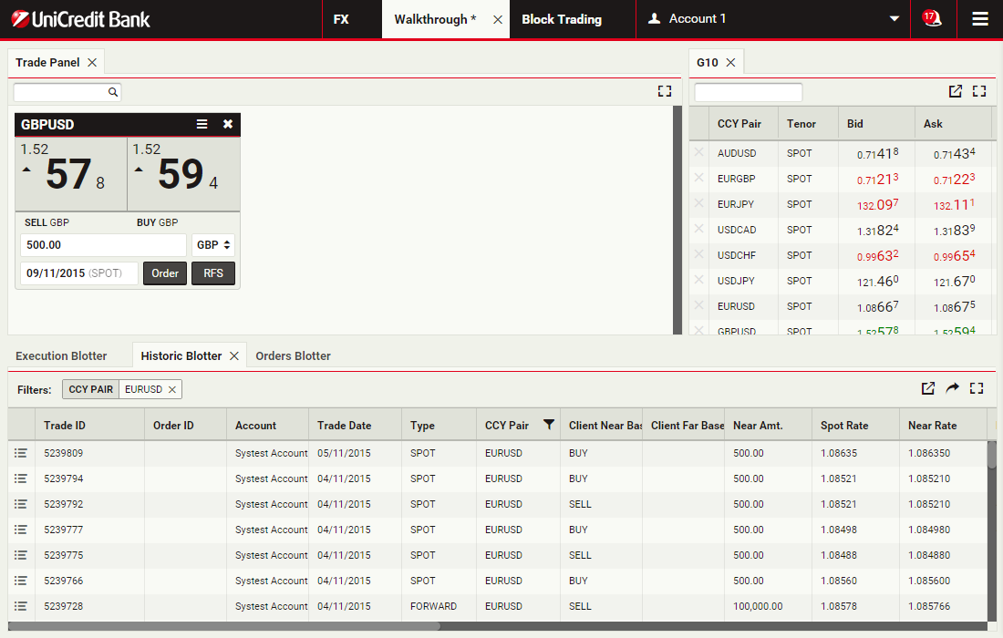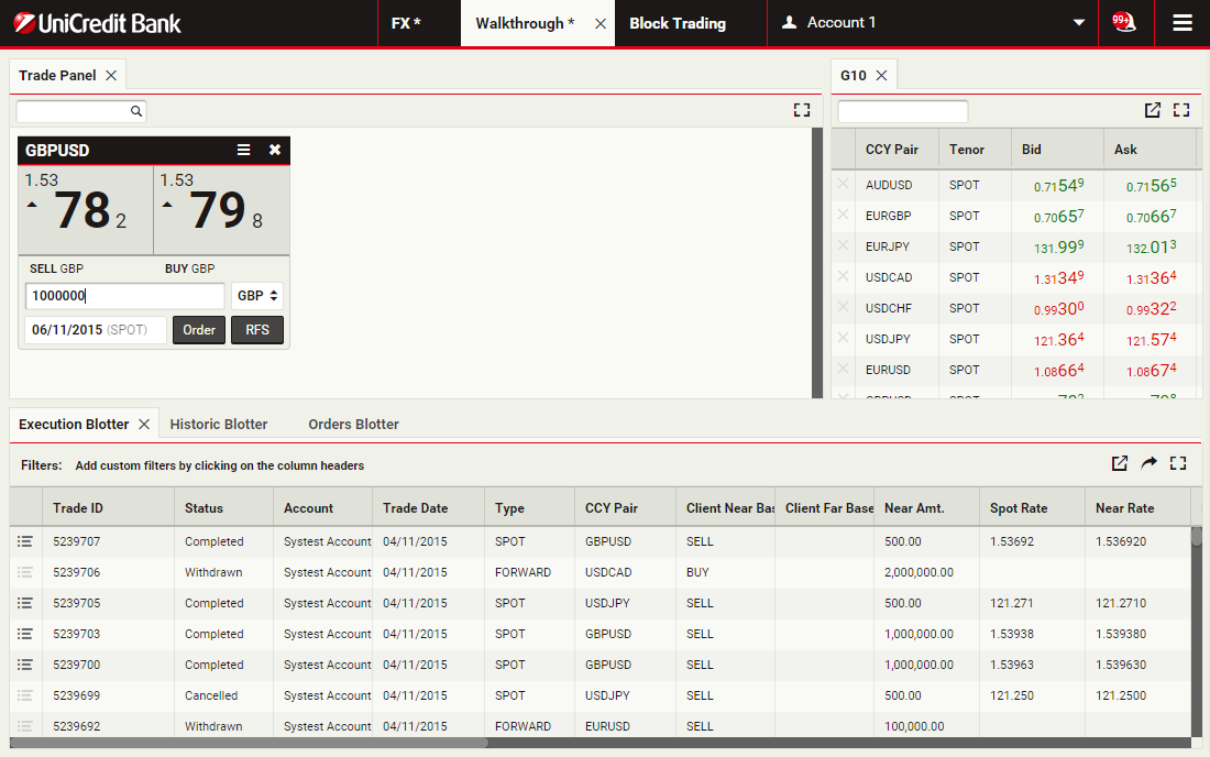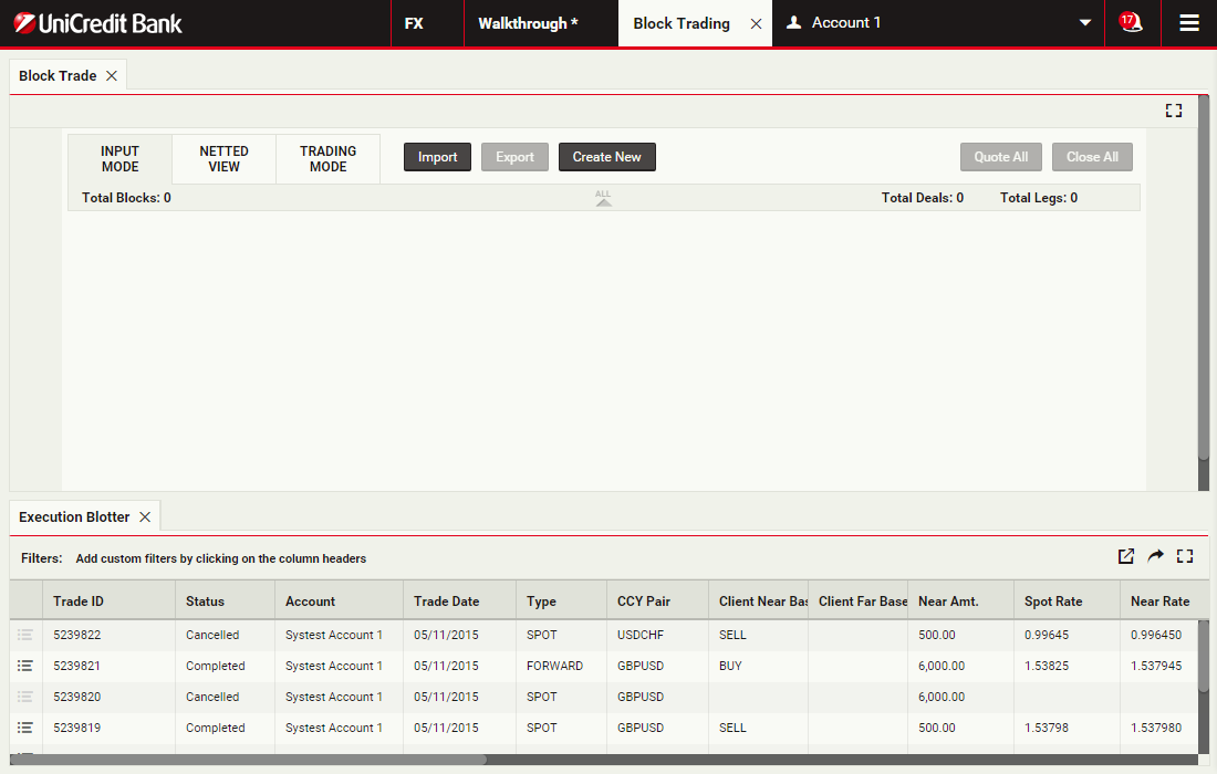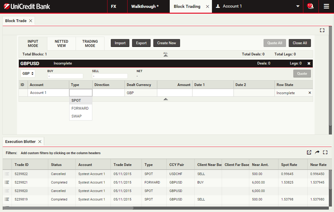 Using block trading, you can submit a request for a single executable quote on simultaneous deals in the same currency pair across multiple accounts and valuation dates. You can enter the deals directly or upload them in a spreadsheet template and UCTrader will automatically validate and net them where possible.