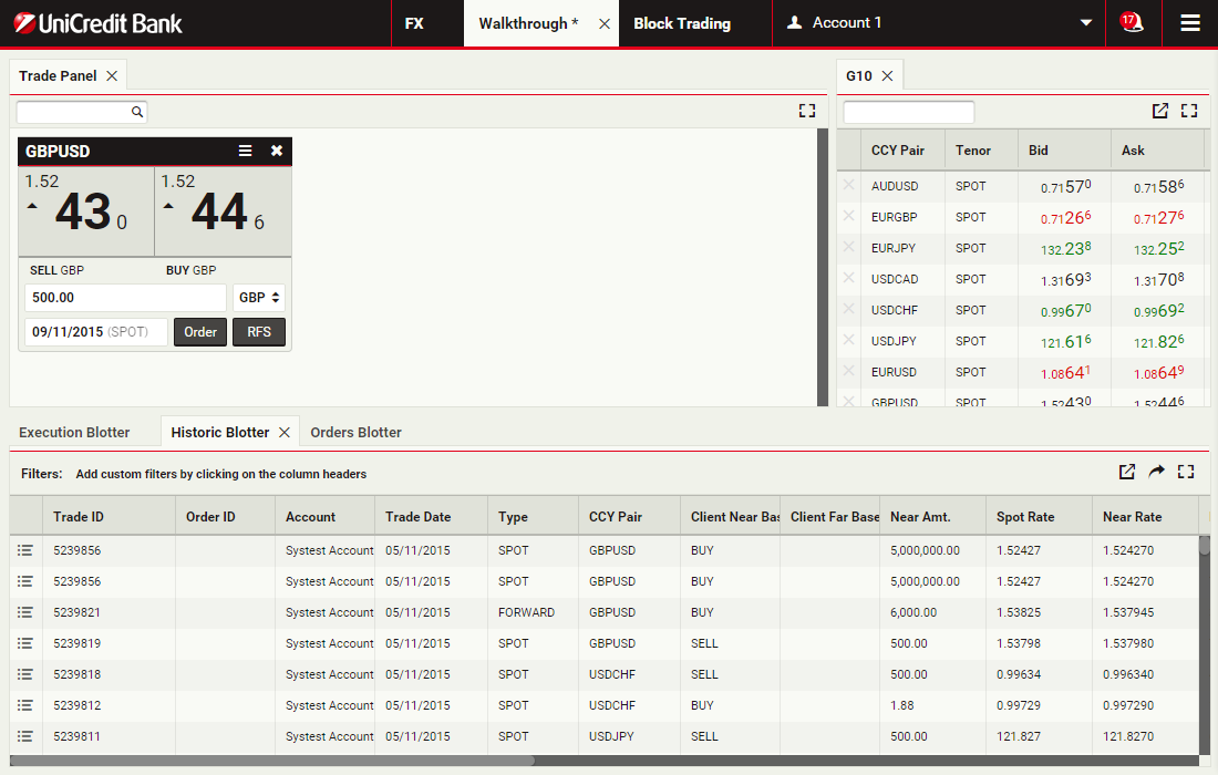 Trade panels contain trade tiles, which show prices and allow you to execute trades.