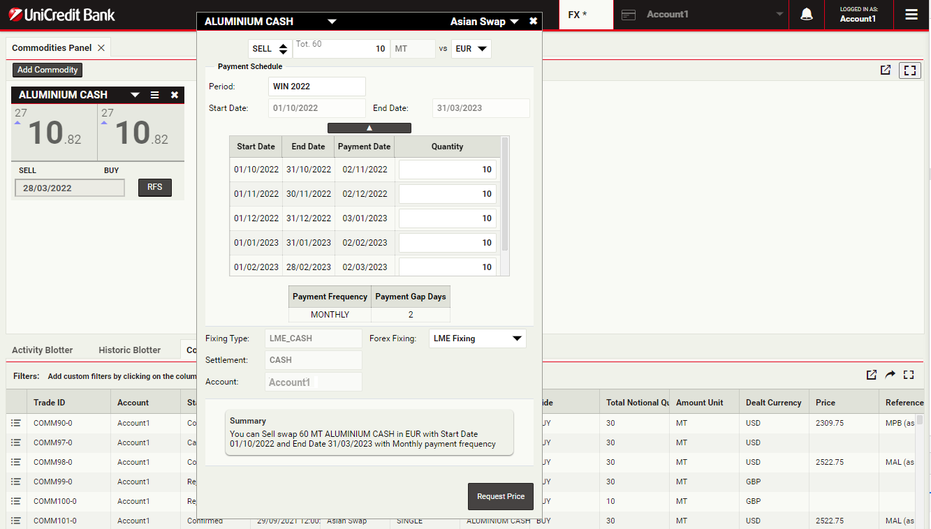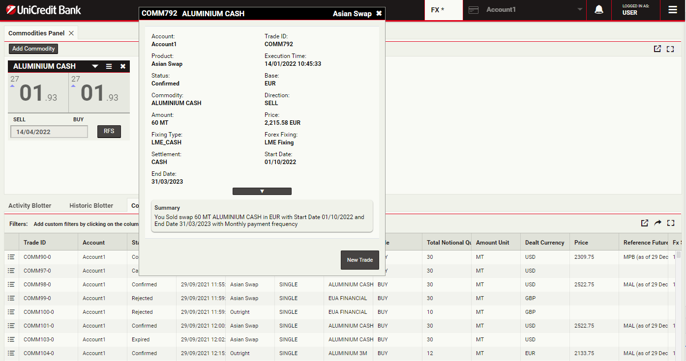 To launch a swap ticket for Aluminium, click RFS on an Aluminium Cash tile