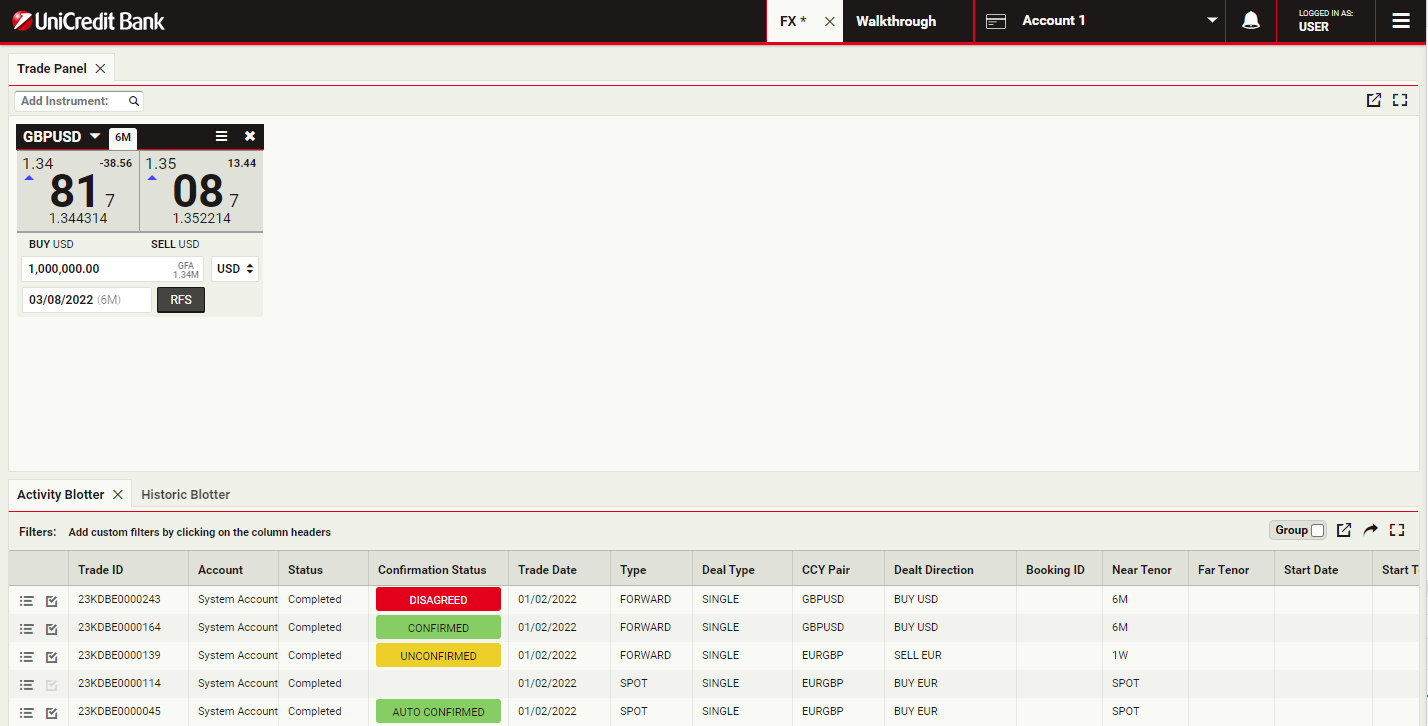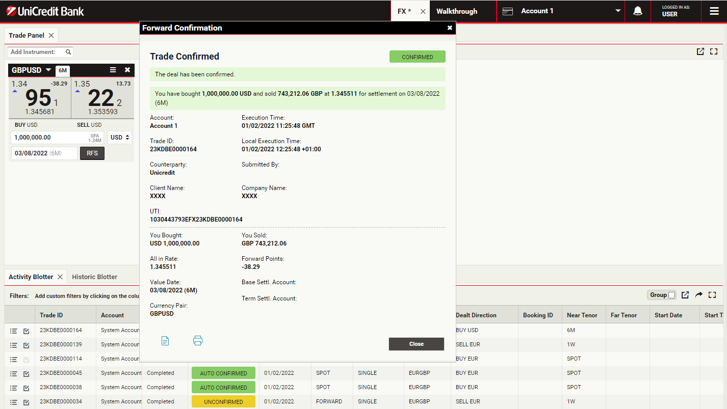 Trades settling before or on the spot date are considered automatically confirmed, whilst all Forward, Swap and Block trades settling after spot must be explicitly confirmed by customers.