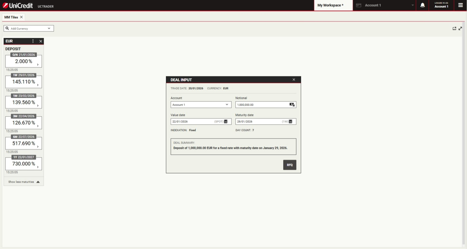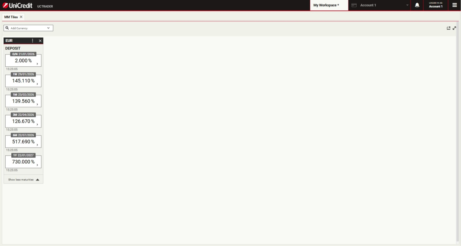 UniCredit is glad to offer Money Markets product via UCTrader platform.This will enable Clients to execute transactions autonomously, in a simple and fast way.Money Market facilitates short-term funding and liquidity management through Deposit instruments with Fixed Rate Interest rate.