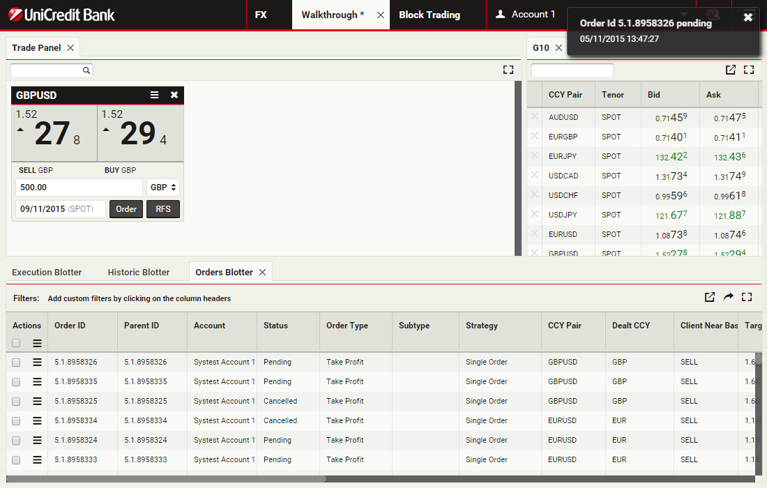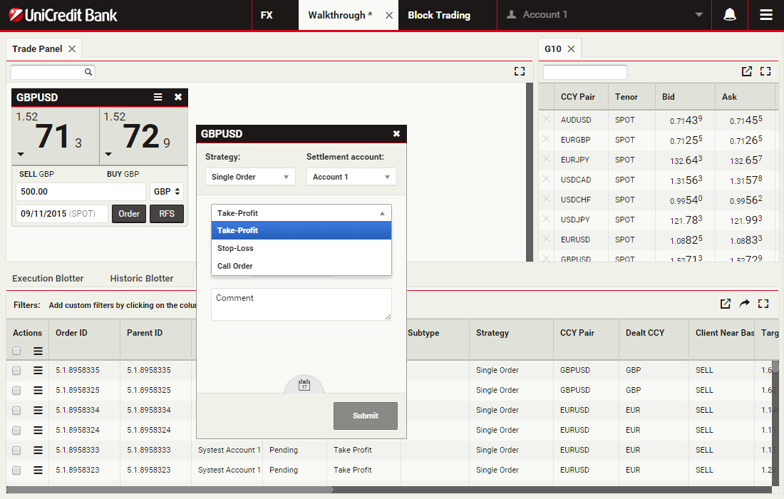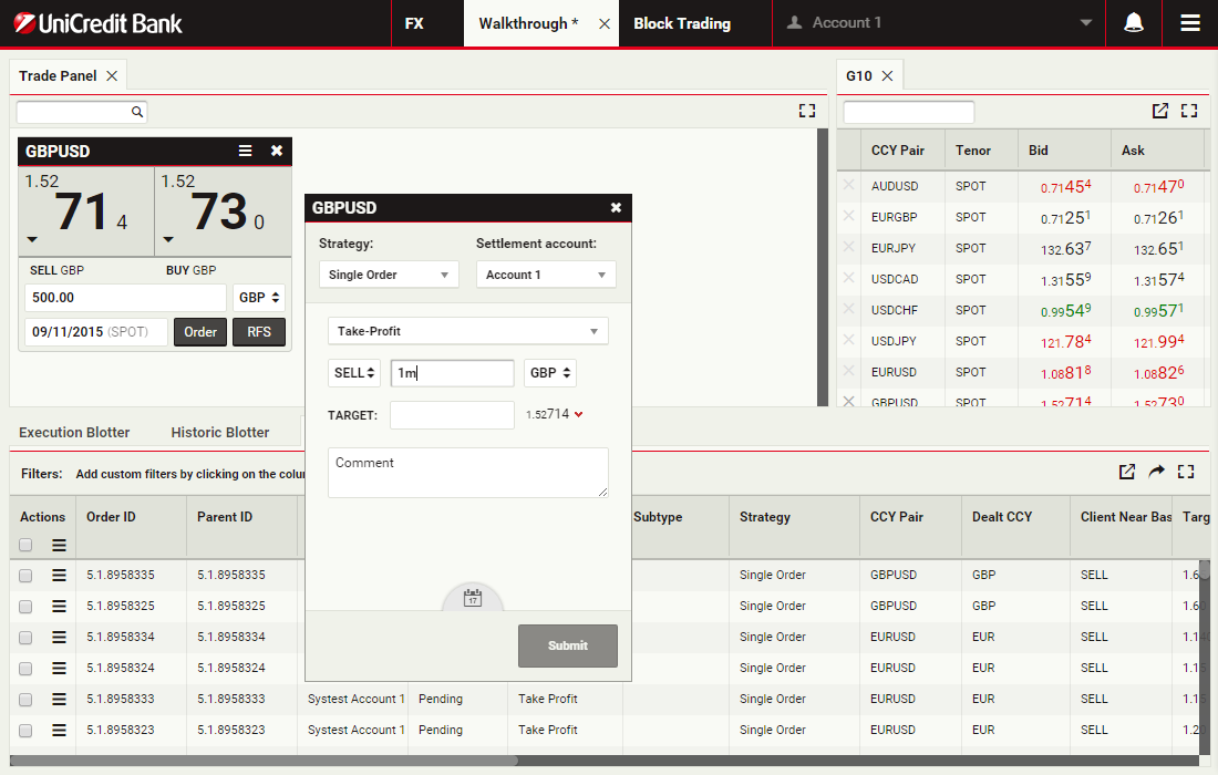 In this walkthrough, you will use a GBPUSD order ticket to prepare and submit a Take Profit order to sell 1 million GBP, with a Time-in-Force (TIF) of 1 month after spot.